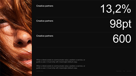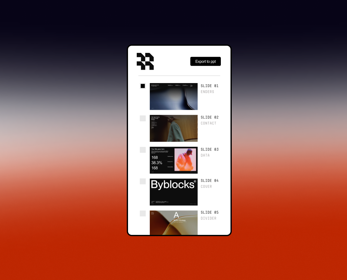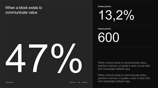 ByBlocks is a unified design ecosystem that combines identity guidelines, editable blocks, brand assets, and modular layouts into a single system powered by shared tokens and variables. It includes a design system file, a library of 500+ slides for Figma, and a plugin for exporting to PowerPoint, Keynote, or Google Slides.